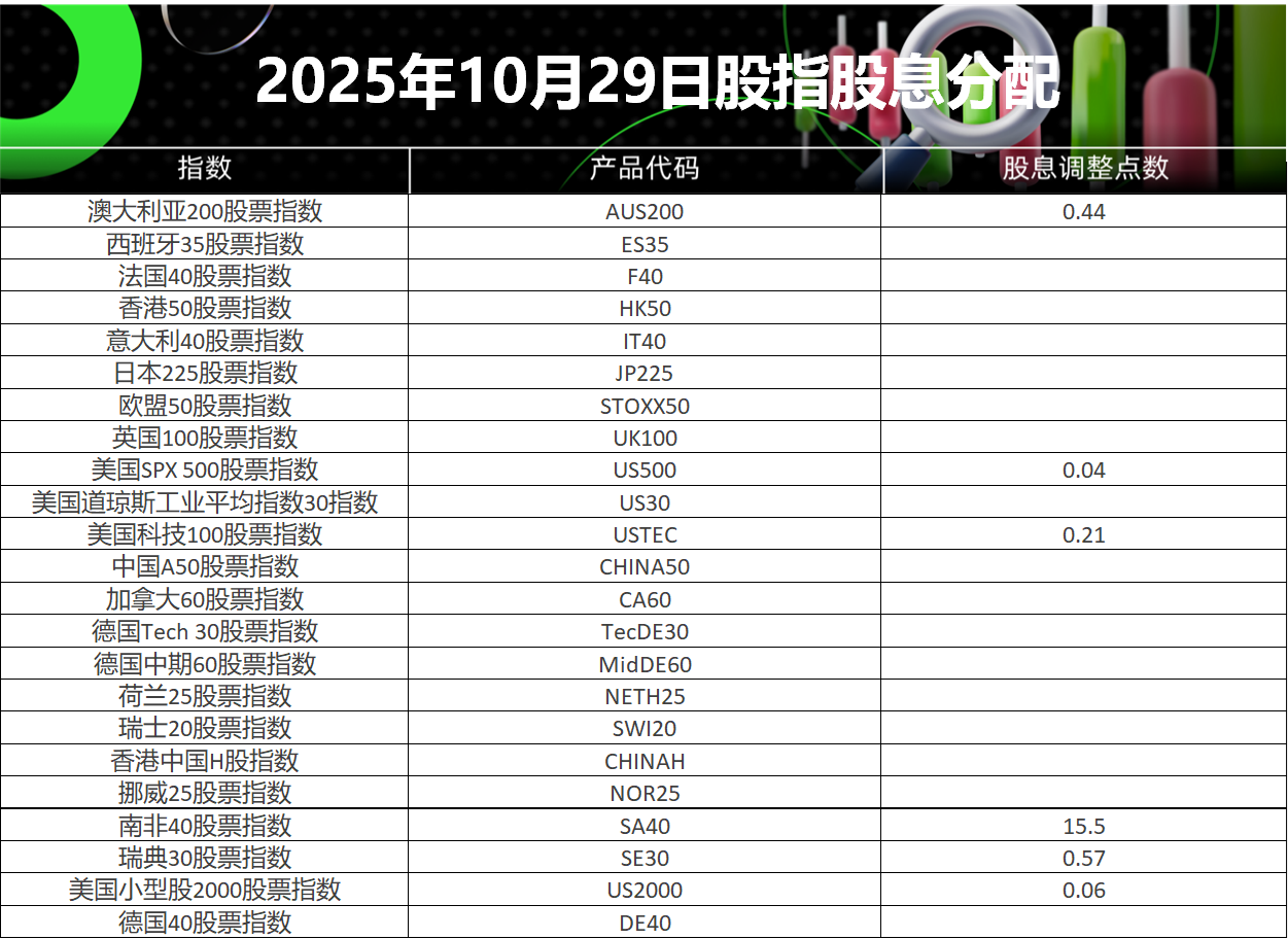 29 Oct 2025 2025年10月股指股息分配表 (2025-10-29) Rachel Yu No Comments 亲爱的客户您好, 请查阅我们更新的2025年10月29日股指股息分配表。 以下所有时间均为平台时间(GMT+3) IC Markets Global 中文团队 中文官网: https://ic-cn-site.com Email: support.cn@icmarkets-cs.com 微博:@IC小帮手