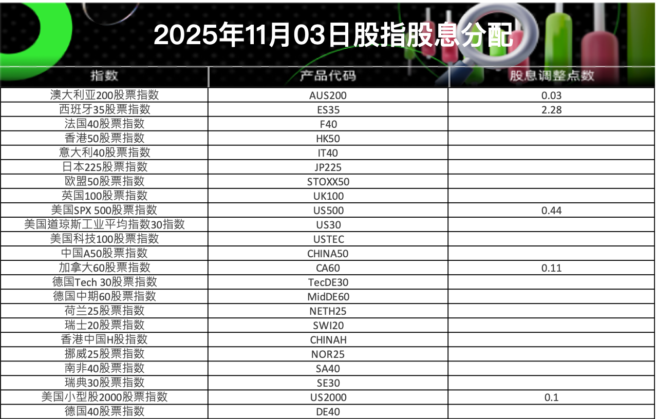 03 Nov 2025 2025年11月股指股息分配表 (2025-11-03) Chloe Lai No Comments 亲爱的客户您好, 请查阅我们更新的2025年11月03日股指股息分配表。 以下所有时间均为平台时间(GMT+2) IC Markets Global 中文团队 中文官网: https://ic-cn-site.com Email: support.cn@icmarkets-cs.com 微博:@IC小帮手