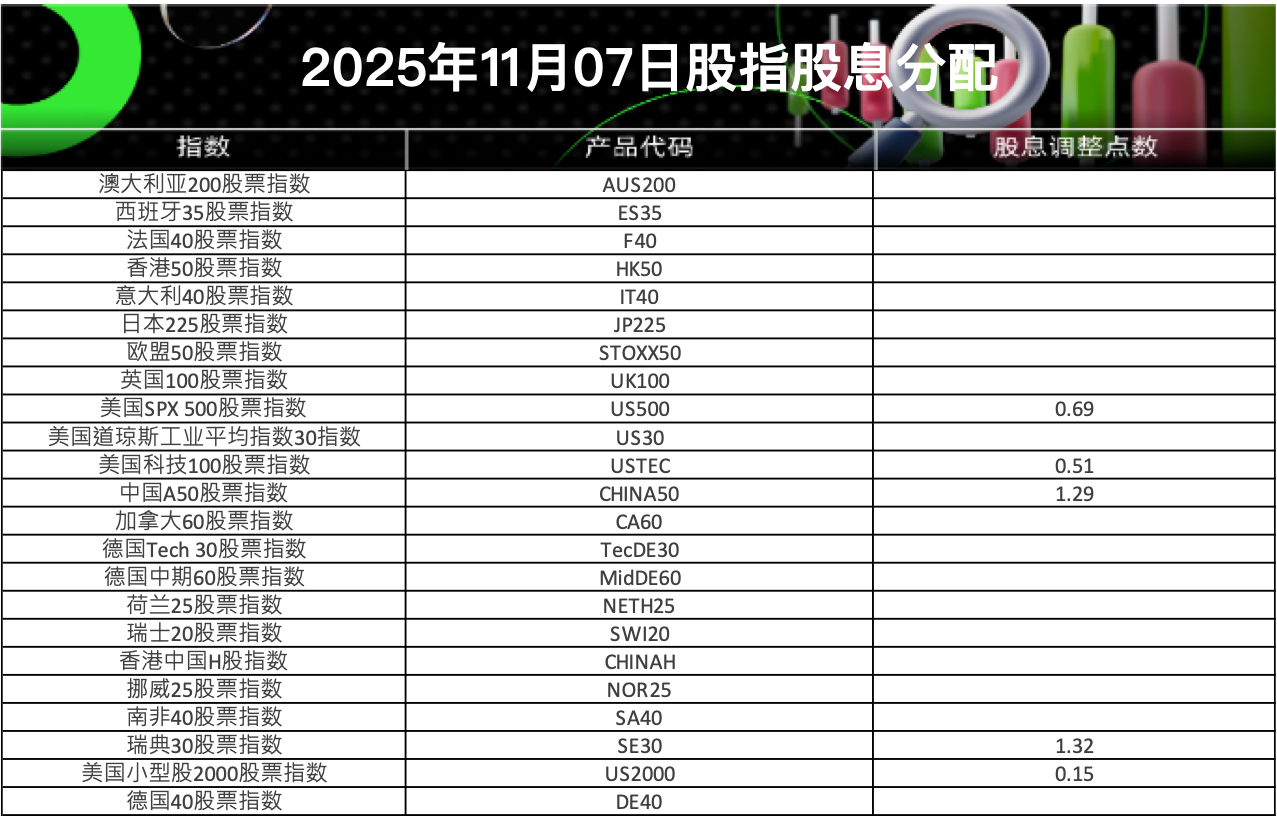 07 Nov 2025 2025年11月股指股息分配表 (2025-11-07) Chloe Lai No Comments 亲爱的客户您好, 请查阅我们更新的2025年11月07日股指股息分配表。 以下所有时间均为平台时间(GMT+2) IC Markets Global 中文团队 中文官网: https://ic-cn-site.com Email: support.cn@icmarkets-cs.com 微博:@IC小帮手