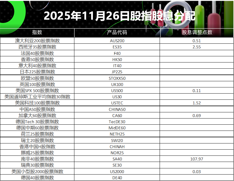 26 Nov 2025 2025年11月股指股息分配表 (2025-11-26) Rachel Yu No Comments 亲爱的客户您好, 请查阅我们更新的2025年11月26日股指股息分配表。 以下所有时间均为平台时间(GMT+2) IC Markets Global 中文团队 中文官网: https://ic-cn-site.com Email: support.cn@icmarkets-cs.com 微博:@IC小帮手