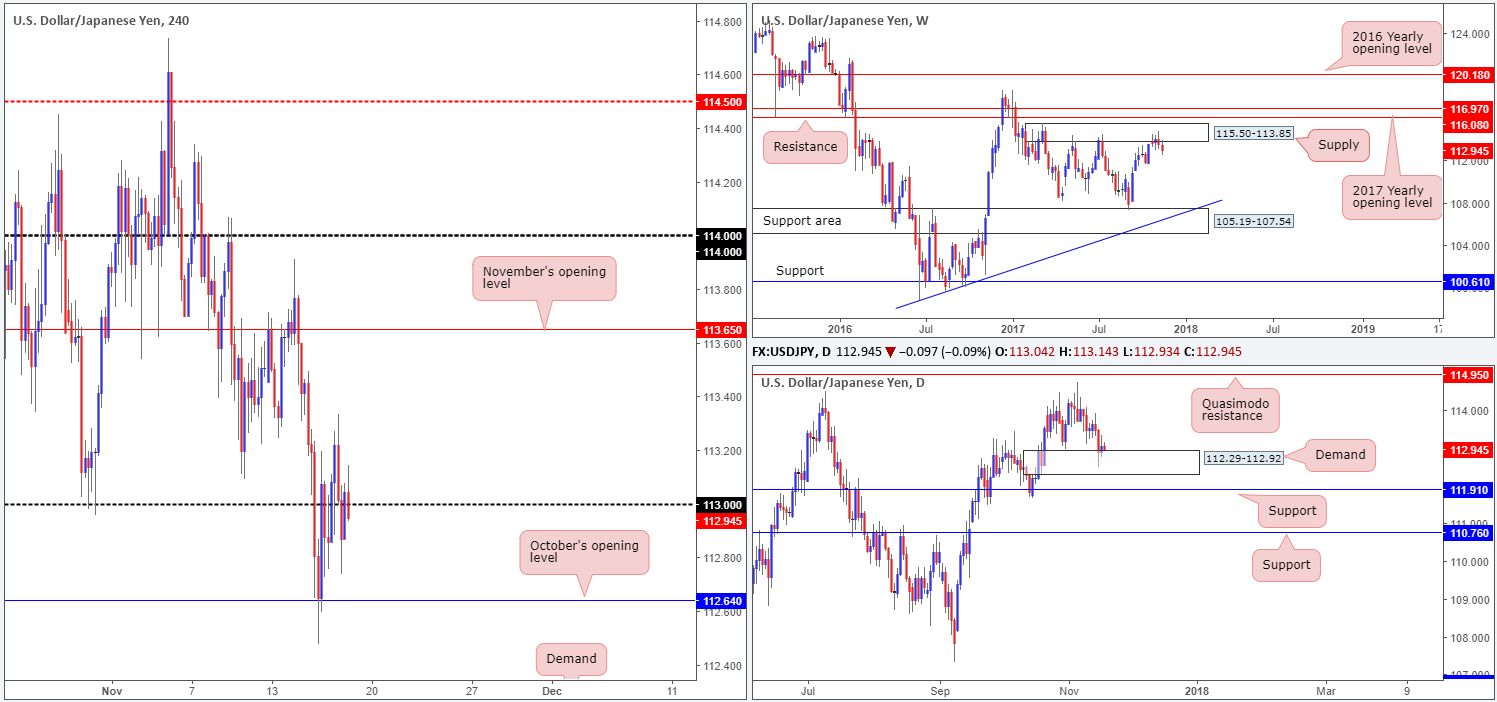 In recent trading, the USD/JPY peaked at 113.33 during the early hours of London, and later whipsawed through the 113 handle to end the day at 113.04. Yesterday’s action, as can be seen on the daily timeframe, printed an inverted hammer candle around the top edge of demand at 112.29-112.92.  Although this is considered to be a bullish signal, traders might want to note where price is trading from! On the weekly timeframe, we can see that the bears remain in the driving seat after selling off from supply fixed at 115.50-113.85.