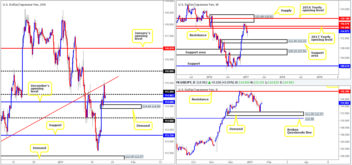 A long from between 1.0000/1.0029 on the other hand, could be something to consider since this zone comprises of both parity and the 2016 yearly level, and also converges nicely with the daily trendline support. However, we would only advise entering long if one is able to pin down a lower-timeframe buy signal (see the top of this report) as the markets are likely to be volatile today given Trump’s inauguration and speech.