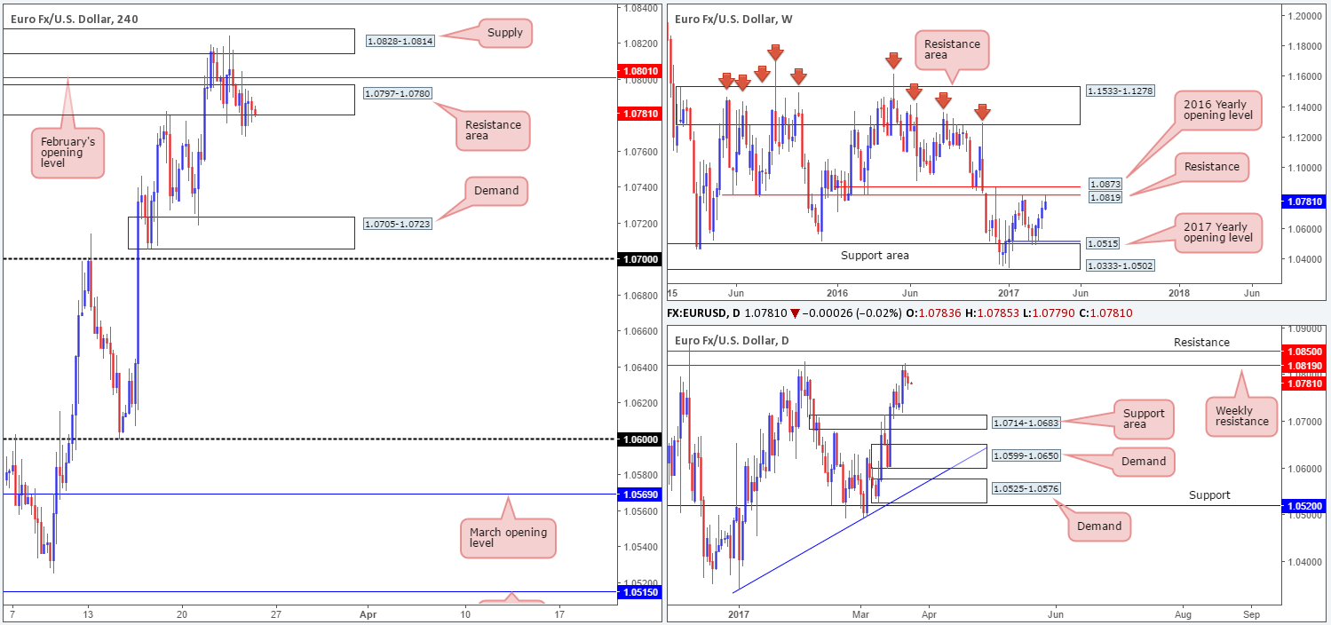 Going into the early hours of yesterday’s US segment, the yellow metal traded to a high of 1253.0 and then aggressively plunged back below March’s opening level at 1245.9. As of current price, H4 action looks to be on course to connect with the support area coming in at 1235.7-1238.1. By the same token, the weekly chart shows that the buyers and sellers continue to battle for position around the resistance line pegged at 1241.2, and daily flow is trading back below the Quasimodo resistance at 1244.3.
