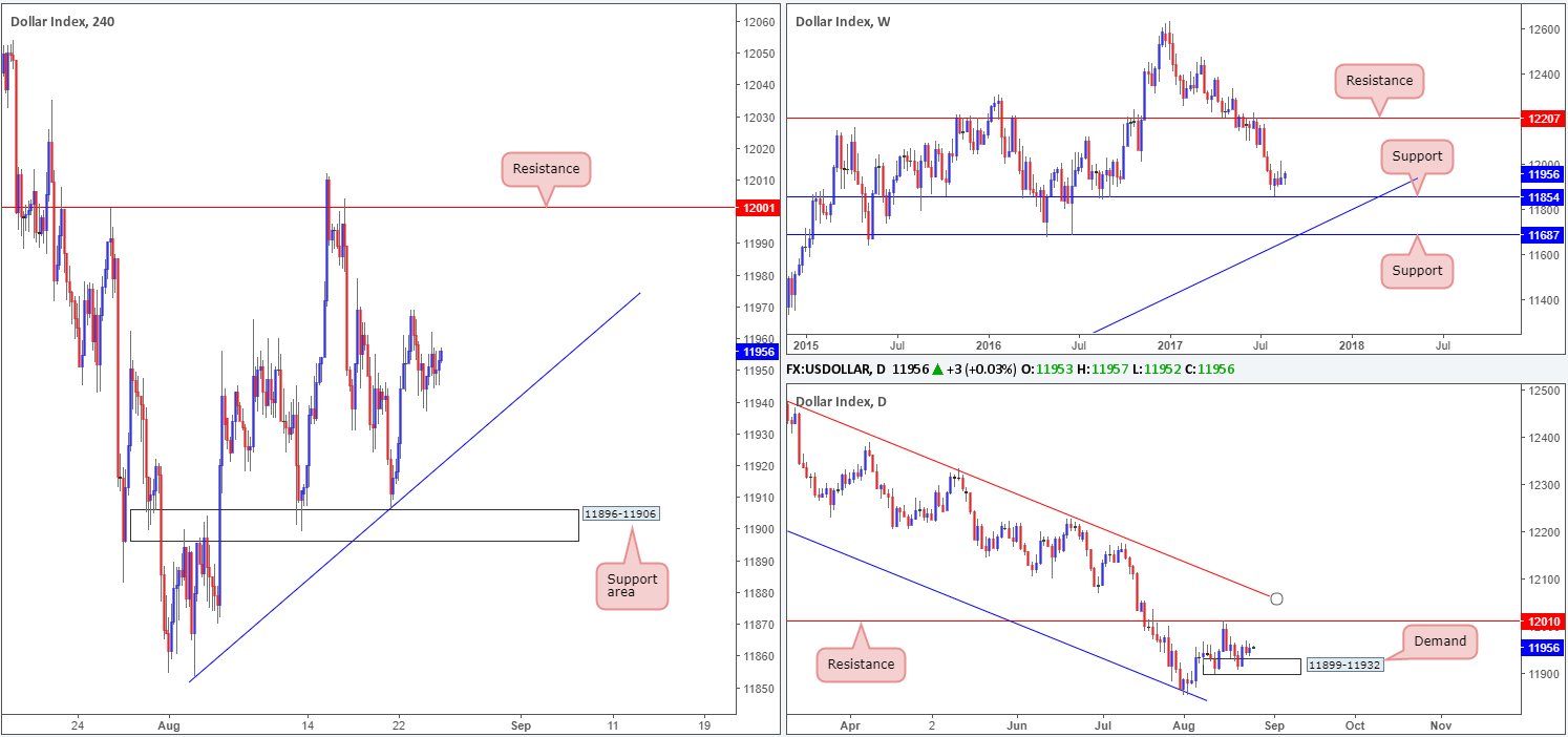 Directly above current price there’s a nearby H4 Quasimodo resistance level at 1.1823 (shadowed closely by August’s opening level at 1.1830). However, considering that the USDX shows room for the H4 candles to push down as far as the trendline support extended from the low 11853, we may see the two noted H4 resistances give way sometime today.