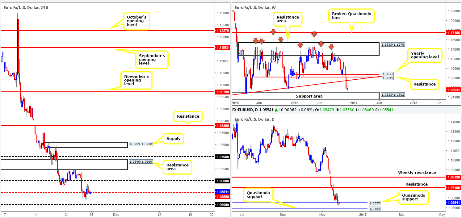 Over on the bigger picture, we can see that daily action shows the pathway south to be somewhat free down to 1.0494: another Quasimodo support. Meanwhile, weekly price continues to trade within a whisker of a major support area coming in at 1.0333-1.0502.