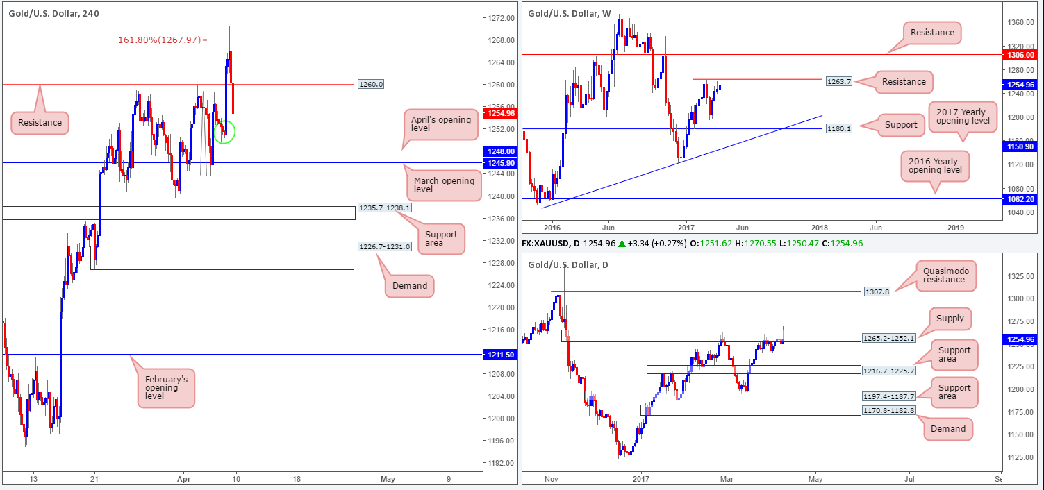 Weekly buyers printed their fourth consecutive weekly gain last week and managed to touch gloves with a weekly resistance level fixed at 1263.7. The week’s close, as you can probably see, chalked up a nice-looking selling wick that could very well encourage shorts to come in a break lower.