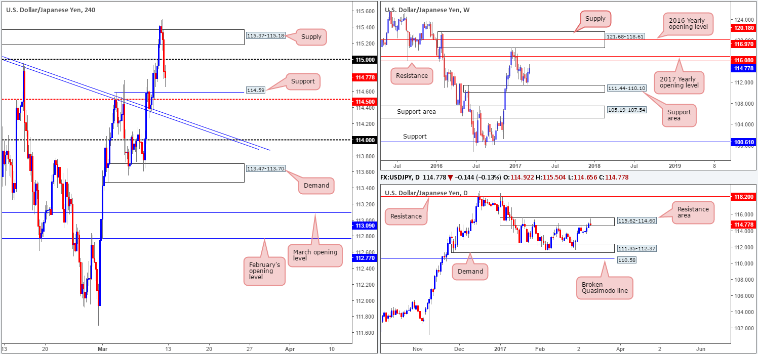 A brief look at recent dealings on the H4 chart shows that there was little response seen from the candles following the release of Friday’s US job’s report. Nevertheless, the pair did end up selling off an hour or so later, taking out the 115 psychological level and closing the week just ahead of a H4 support registered at 114.59/H4 mid-way support at 114.50.