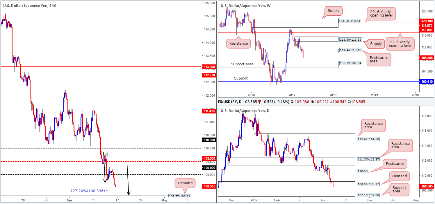 Daily demand at 1.2323-1.2379 (houses the said 2017 yearly opening level), as you can see, held firm last week and lifted price up to within an inch of resistance coming in at 1.2582. To our way of seeing things, this has formed a nice-looking range, which is certainly worth keeping an eye on.
