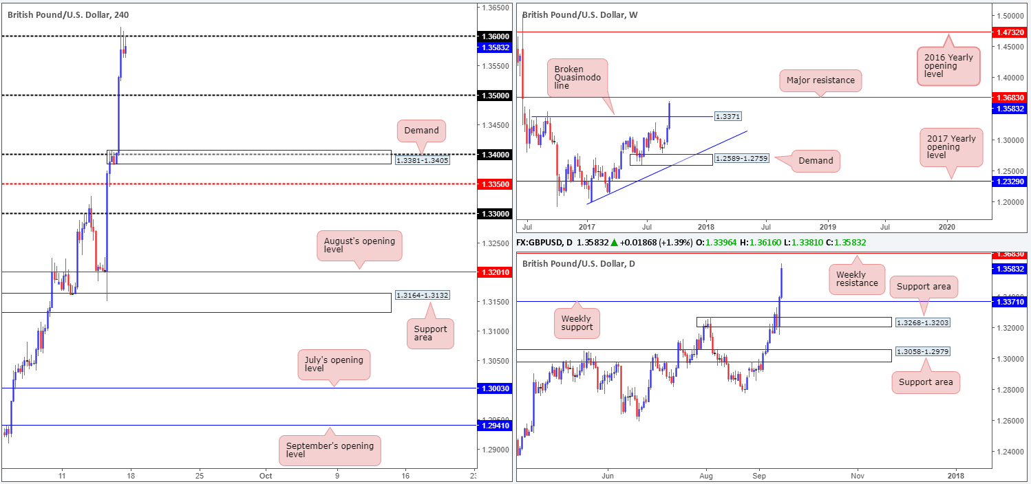 - Buys: Watch for H4 price to engulf 1.36 and then look to trade any retest seen thereafter ([waiting for a H4 confirming bull candle to form following the retest is advised] stop loss: ideally beyond the candle’s tail).