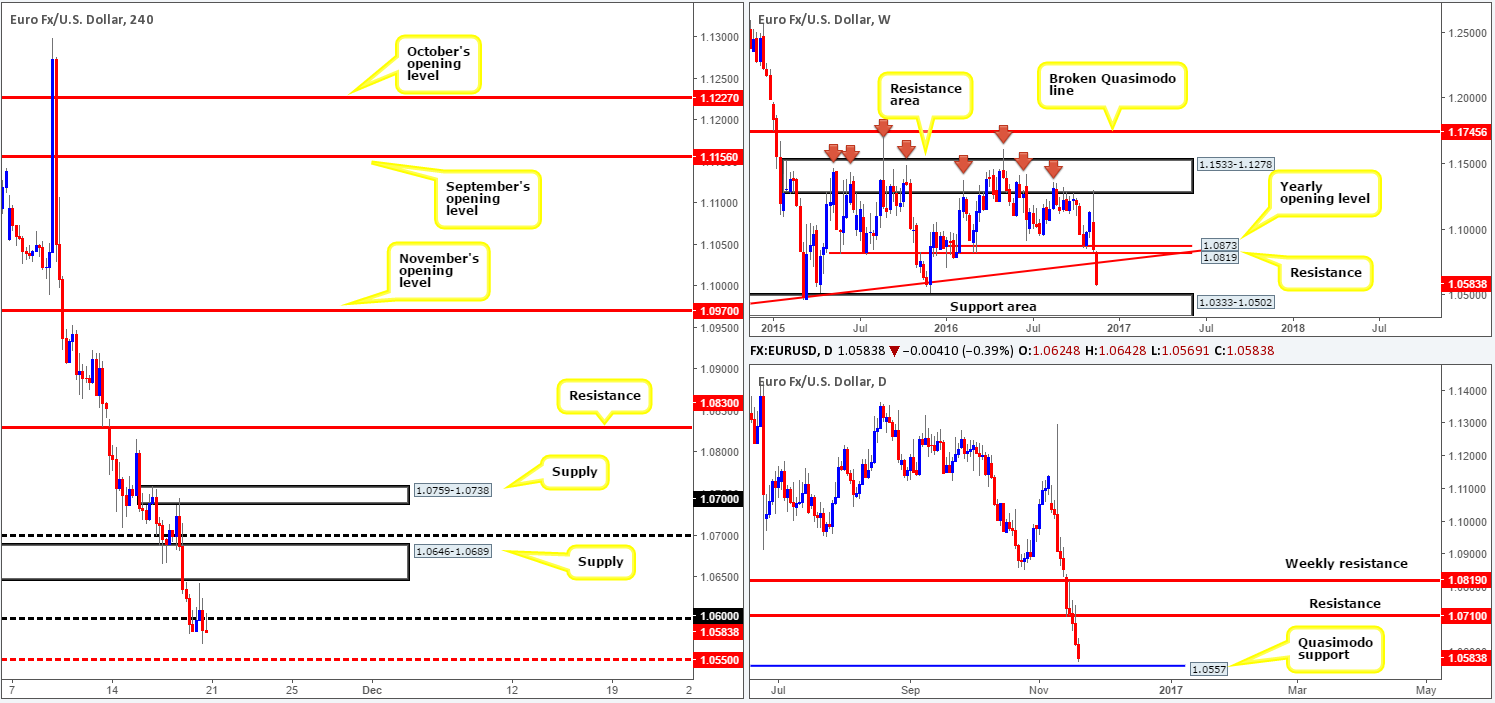 Our suggestions: While the path south may very well be clear down to 1.0550 on the H4 chart, selling right now is difficult considering how close by the daily Quasimodo support at 1.0557 is located. What really grabs our interest, as we mentioned above in the daily section, is the Quasimodo support seen directly below it at 1.0494. Not only has this level fused a connection with the top edge of the weekly support area, but it sits six pips below the psychological band 1.05! This confluence is, at least in our book of technical setups, enough to condone a pending buy order at 1.0495 with a stop placed below the head of the daily Quasimodo formation at 1.0459.