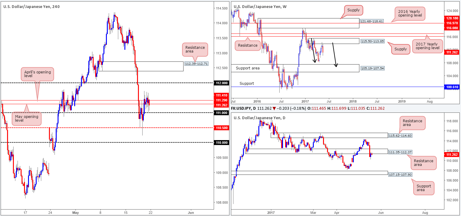 A brief look at recent dealings on the H4 chart shows that price took on more of a sober approach on Friday, vacillating around April/May’s opening levels at 111.41/111.29. As you can see, directly below current price sits the 111 handle, whereas to the upside we see that we have the 112 handle in sight.