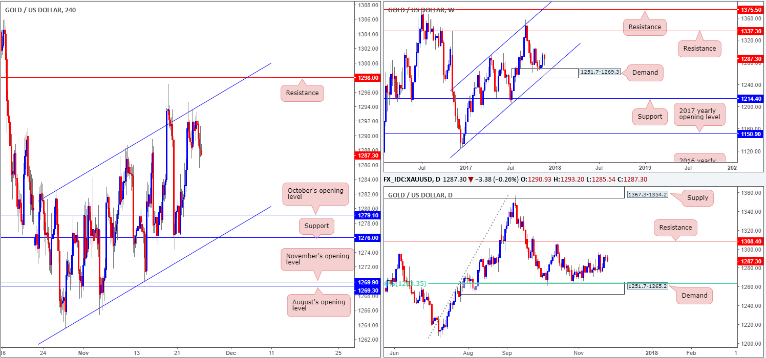 After connecting with daily demand at 1251.7-1265.2 (housed within the lower limits of a weekly demand base seen at 1251.7-1269.3) in late October, the gold market has since been grinding north. The next upside objective on the daily scale can be seen at 1308.4: a resistance level that boasts a reasonably strong history.
