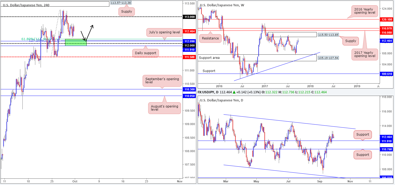 Consequent to a rather lackluster performance on Friday, H4 price spent the day trading from local support found at 112.64. Despite this, the road to 112 remains in view and is still, as highlighted in Friday’s report, an incredibly appealing level at the moment. Here’s why: