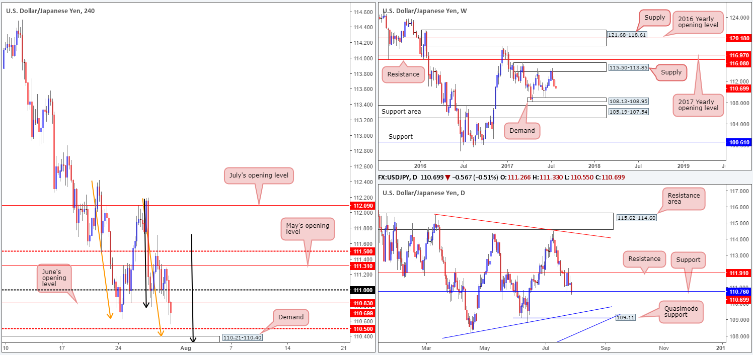 A brief look at recent dealings on the H4 chart reveals that the bulls eventually threw in the towel around the 111 handle, allowing the unit to test, and ultimately engulf, June’s opening level at 110.83. What’s also notable from a technical perspective here is the two AB=CD bullish patterns in the making (black/orange arrows). Both terminating around the top edge of a small demand base at 110.21-110.40, this area is, in our opinion, stable enough to bounce price this week since it was formed on the break of a Quasimodo left shoulder at 110.27. In addition to the Harmonics, we also like the fact that the mid-level number 110.50 is positioned directly above. A great deal of traders look to buy these levels and place stops a few pips below. By driving through this level, sell stops will be filled from both buyers looking to long and sellers looking to play the breakout, and therefore provide liquidity for the big boys to buy.