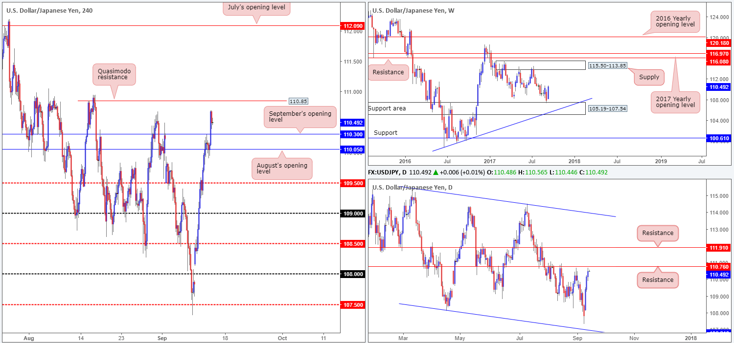 Propelled by recent US tax reform talks, the USD/JPY ripped through offers positioned at September’s opening level drawn from 110.30. As you can see, this has opened up the path north for the H4 candles to test the Quasimodo resistance at 110.85. Also of particular interest, daily price is now trading within touching distance of resistance registered at 110.76. On the other side of the coin, however, weekly price is seen rallying from a support area penciled in at 105.19-107.54.
