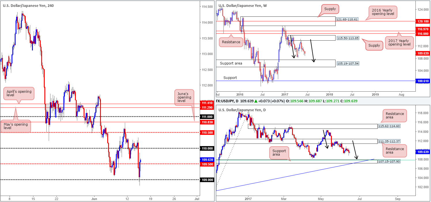 • Sells: Watch for H4 price to engulf 109.50 and then look to trade any retest seen thereafter ([waiting for a lower-timeframe sell signal to form following the retest – see the top of this report – is advised] stop loss: dependent on where one confirms this level).