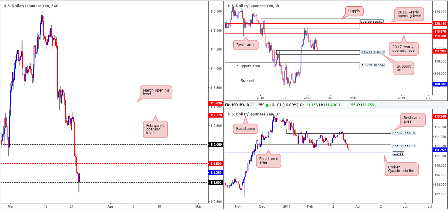 Beginning with a look at the weekly chart this morning, the buyers and sellers remain battling for position around the weekly support area at 111.44-110.10. Down on the daily chart, nevertheless, we can see that the sellers printed a seventh consecutive bearish candle yesterday, which happened to engulf the daily demand base at 111.35-112.37. Leaving the nearby daily broken Quasimodo line at 110.58 unchallenged, price is now seen retesting the underside of the recently broken daily demand as resistance.