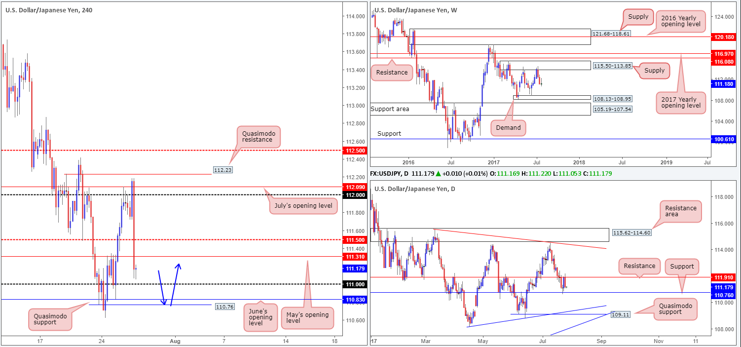 Beginning this morning’s report with a look at the weekly timeframe, we can see that the unit is ranging between supply at 115.50-113.85 and demand at 108.13-108.95. Along similar lines, daily price is also seen sandwiched between support coming in at 110.76 and resistance at 111.91.