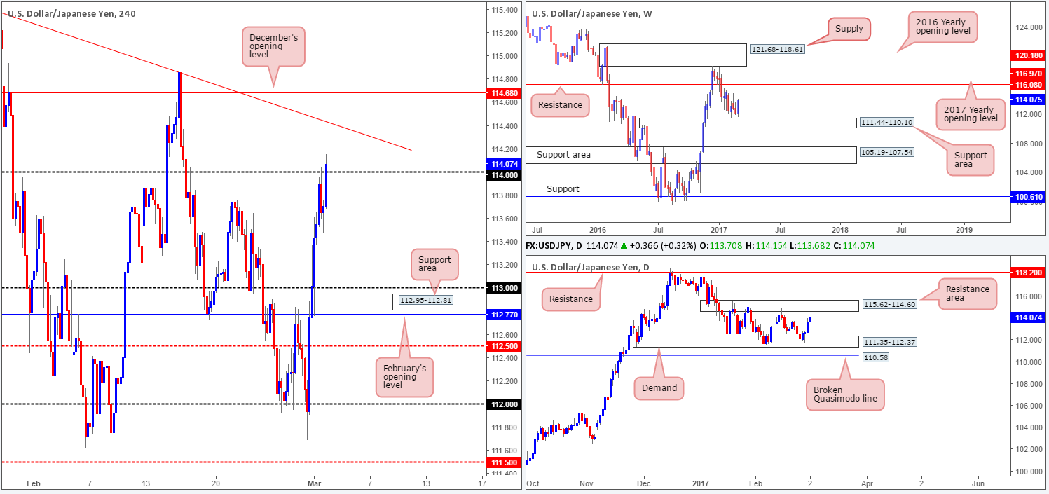 Although the buyers look in good form at the moment, this momentum will likely diminish should price continue to rally beyond 114. Not only is there a reasonably strong H4 trendline resistance taken from the high 115.62 seen just above here, but there is also the daily resistance area coming in at 115.62-114.60 and a H4 mid-way resistance at 114.50 to contend with.