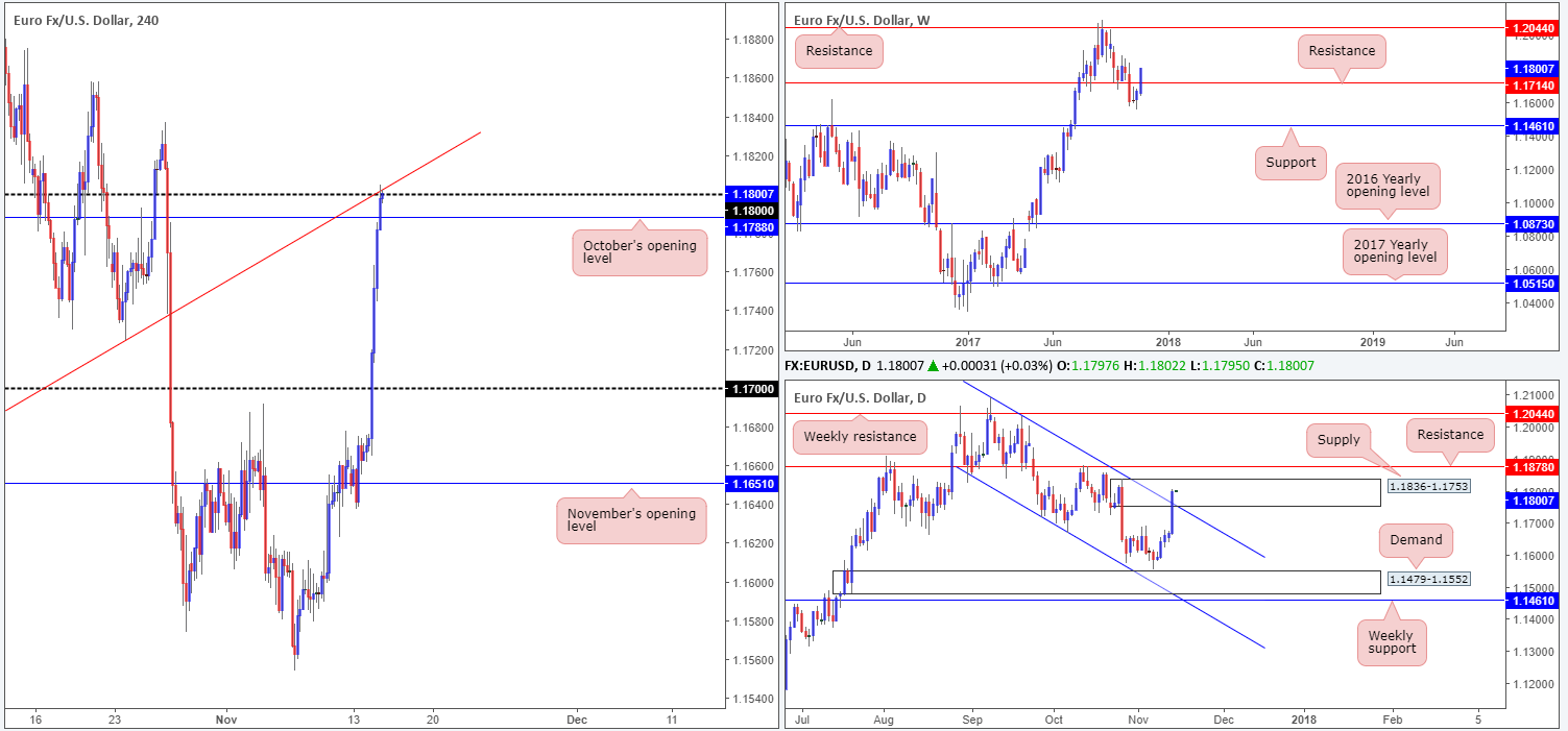 The USD/JPY ended the day marginally in the green on Monday, despite selling off from November’s opening level at 113.65. You may recall that this line was a noted sell zone in yesterday’s report, and since H4 price responded with a near-full-bodied bearish candle, it was a high-probability short. We did not take the trade, however, due to still being long the EUR/USD. Nevertheless, should we have done, this would have likely been a breakeven trade since price moved to a low of 113.24 before rotating back to the upside.