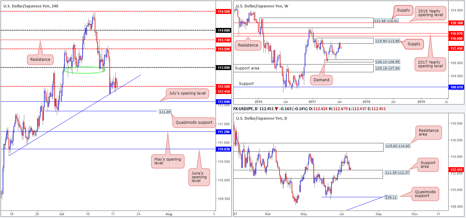 Monday’s session, as you can see, took on more of a sober tone in comparison to Friday’s selloff. H4 price remains afloat above the mid-level support at 112.50, which boasts additional support from a H4 trendline taken from the low 110.64 and the top edge of a daily support area at 111.35-112.37.