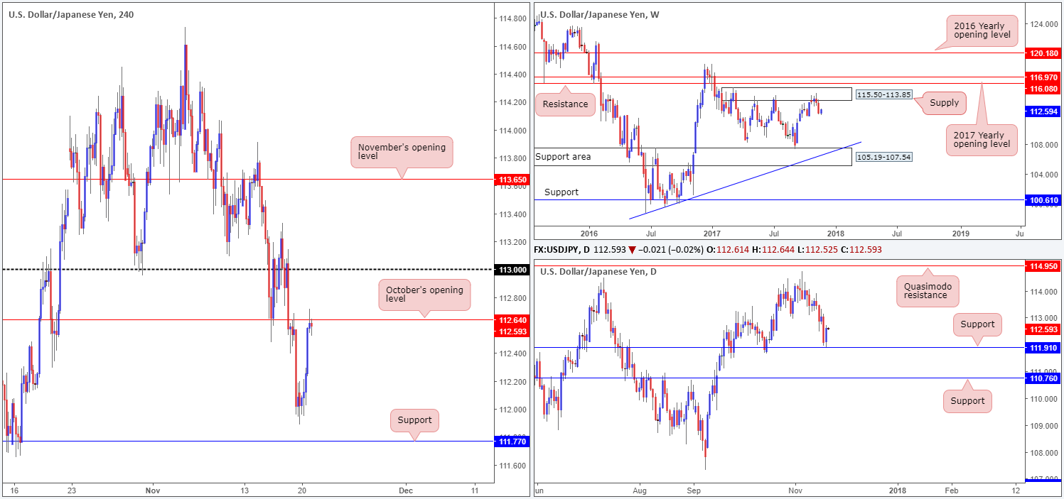 As is evident from the daily timeframe this morning, support at 111.91 held beautifully on Monday and as a result printed a near-full-bodied bullish candle. Despite this likely arousing the interest of buyers in this market, it might be worth noting where price came from: a monstrous weekly supply coming in at 115.50-113.85! In addition to this, October’s opening level seen on the H4 timeframe at 112.64 is also now in the fray.