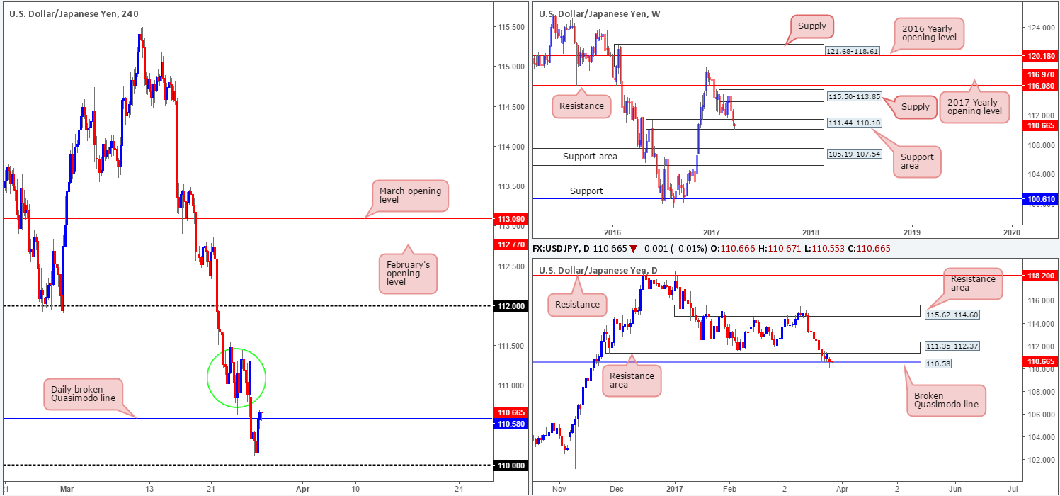 Leaving the psychological handle 110 unchallenged, the pair gravitated north going into the early hours of yesterday’s US segment. This, as you can see, eventually forced H4 price back above the daily broken Quasimodo line at 110.58, consequently forming a reasonably nice-looking daily buying tail. The other key thing to note here is that the weekly candles remain trading within the walls of a support area fixed at 111.44-110.10.