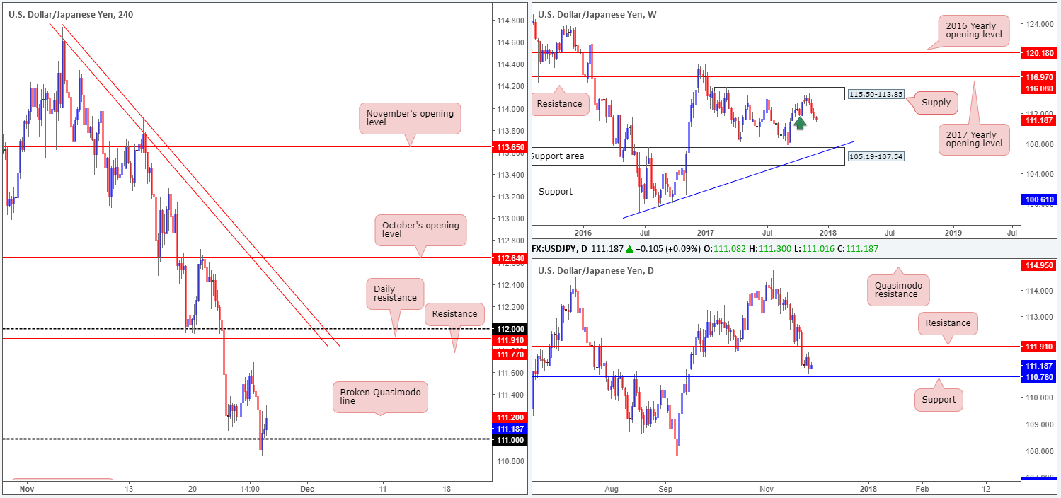 Yesterday’s selling, as you can see on the H4 timeframe, cracked through the H4 Quasimodo at 111.20 and whipsawed through the 111 handle. As we write, price is seen retesting the underside of 111.20.