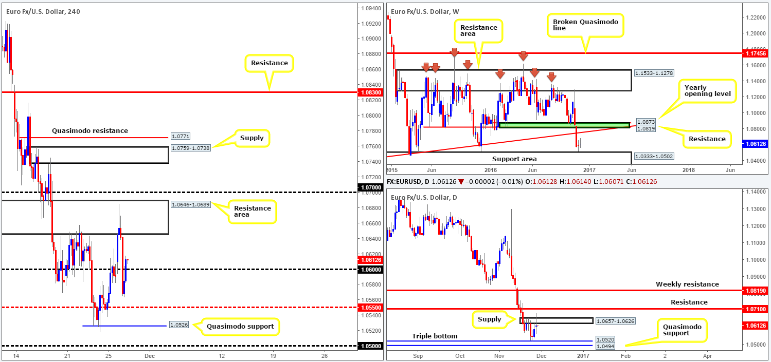• The 1.07 handle. Granted, price will have to tackle the current H4 resistance area before reaching this level, but think of all those buy stops sitting just above this zone! Seeing as how psychological boundaries are generally prone to fakeouts, we would recommend waiting for lower timeframe confirming action before taking a trade around 1.07 (see the top of this report).