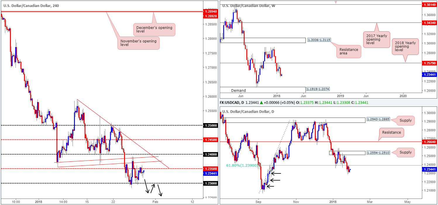 Moving things down a notch, daily action shows us that price recently came into contact with a daily support band at 1.2359, after fading a daily Quasimodo resistance located at 1.2495. A violation of 1.2359 could lead to a move being seen down to a daily support area coming in at 1.2246-1.2164.