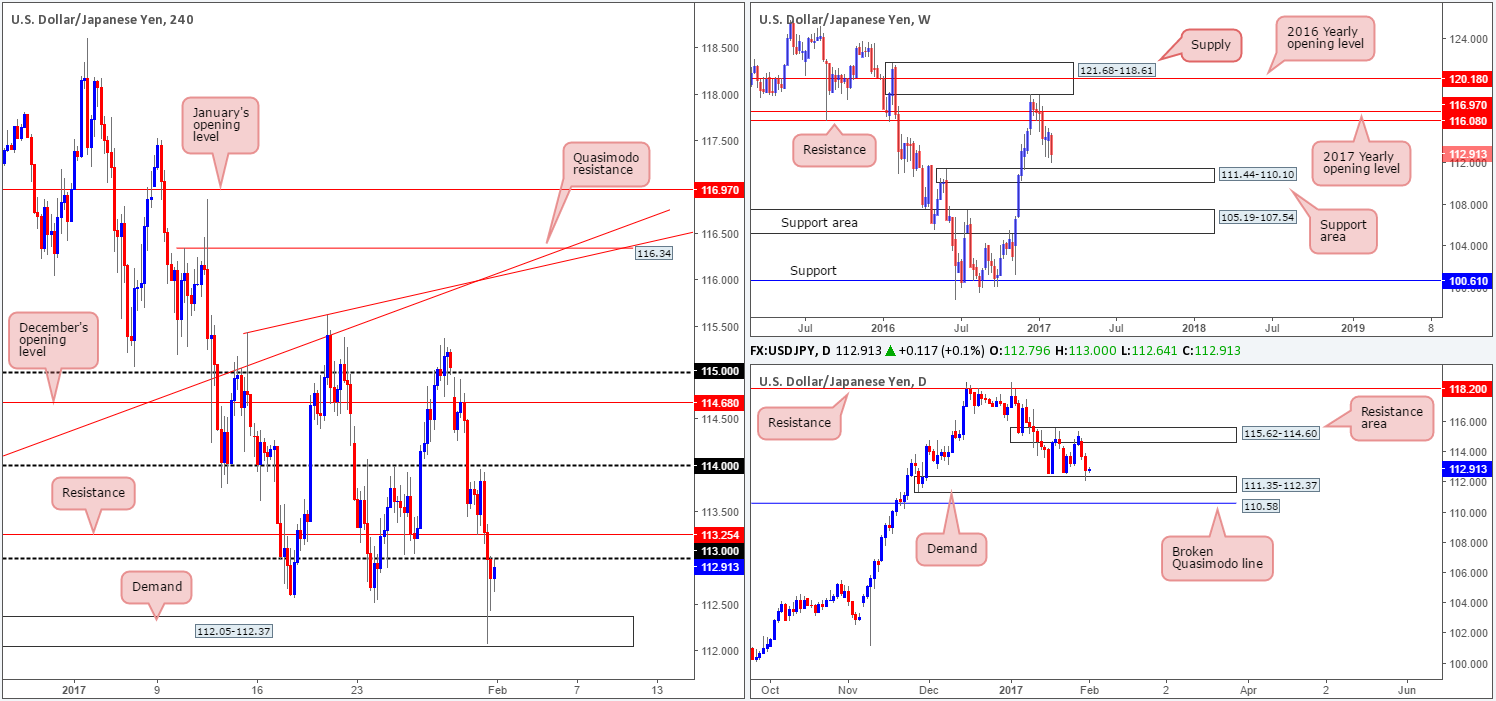 In our previous report, we noted to keep an eyeball on the H4 demand area penciled in at 112.05-112.37. This base commanded the backing of the current daily demand at 111.35-112.37, which itself is further reinforced by a weekly support area at 111.44-110.10. As is evident from the H4 chart, the unit aggressively drove into the jaws of this zone yesterday and responded beautifully! The recent downside move was brought about by comments made by US President Trump’s trade advisor saying that the euro was ‘grossly undervalued’, along with disappointing US data. Well done to any of our readers who managed to secure a buy from the above noted H4 demand, as current H4 price looks set to continue northbound up until at least the H4 resistance at 113.25. Be that as it may, we would strongly advise taking some profits off the table around 113 and reducing risk to at least breakeven!