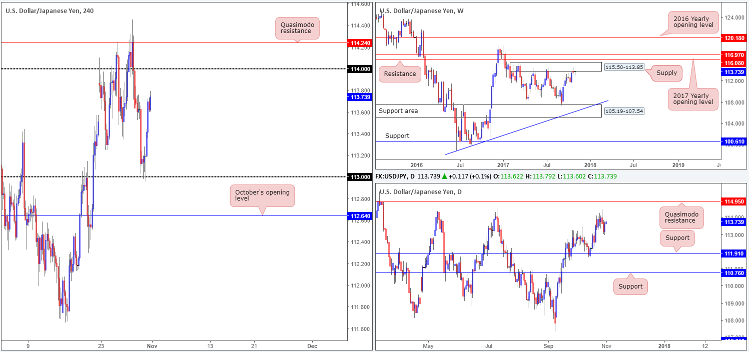Suggestions: According to the technicals, the next upside target on the H4 scale can be seen at the 114 handle, followed closely by a Quasimodo resistance at 114.24. Considering the location of price on the weekly timeframe, both levels could hold the pair lower today. With that being said, however, we would personally favor the Quasimodo for shorts, since round numbers tend to be a magnet for fakeouts.