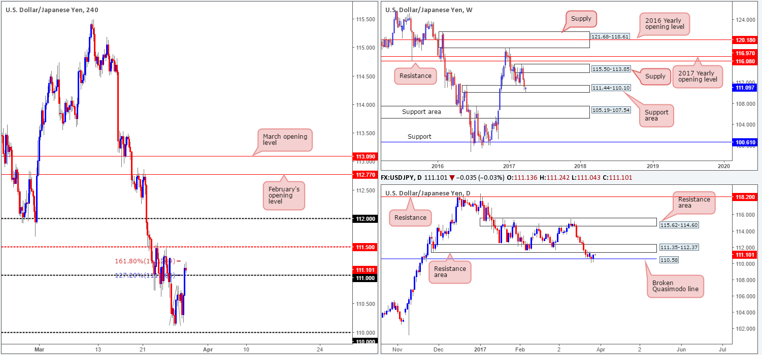 Swinging over to the H4 chart, we can see that price recently breached the 111 handle and is seen trading nearby a 161.8% Fib ext. at 111.25 (taken from the low 110.11). Since early March, momentum has been firmly on the side of the bears. Therefore, the 161.8% ext., the aforementioned daily resistance area and the mid-way level at 111.50 forms a rather interesting base of resistance. Despite this confluence, there are two cautionary points to consider: