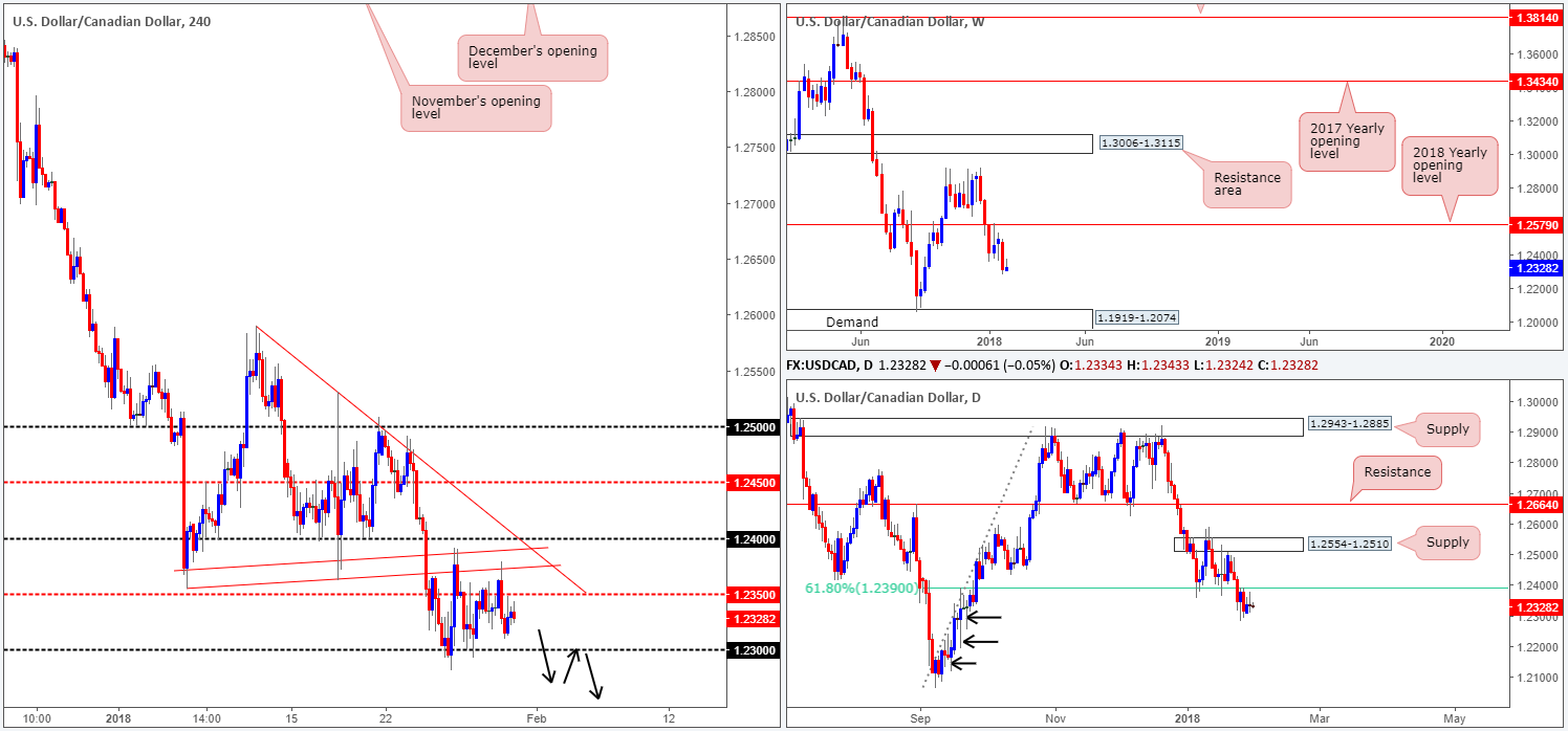 Our bias, at least medium/long term, remains short. This is largely because of where price is located on the bigger picture. A H4 close beneath 1.23 would, in our view, further confirm this bearish bias and open up the possibility for a short trade. However, we would not label a breakout as a high-probability setup as they have a tendency to recoil. Instead, consider waiting for a H4 close to form below 1.23 and look to then trade any (successful) retest of this number  thereafter (as per the black arrows), targeting the noted H4 Quasimodo support at 1.2236 as an initial take-profit zone.