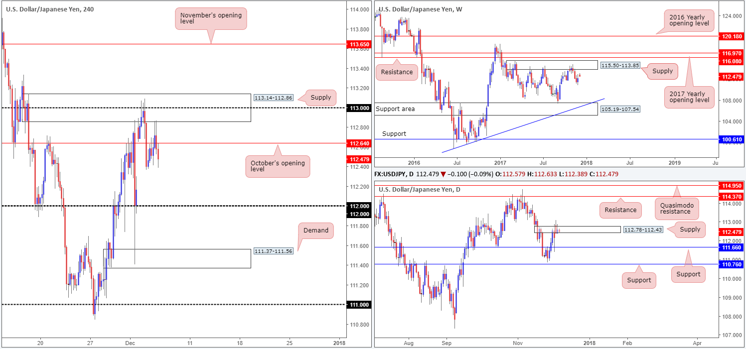 During the course of yesterday’s sessions, the USD/JPY whipsawed through October’s opening level at 112.64 and shook hands with the underside of a H4 supply base at 113.14-112.86. The selloff from this region has so far been dominant. Should 112.36, the 4th Dec low, be consumed, the next downside target on the H4 scale can be seen around the 112 handle. A move down to here will also fill the weekend gap.